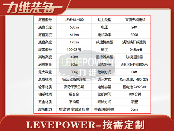 橡膠履帶底盤長630mm,橡膠履帶寬641mm,橡膠履帶高175mm,PWM航模遙控器控制,通信方式Can總線,232,485,橡膠履帶機(jī)器人功能強(qiáng)大,用途廣泛。特種履帶底盤動力采用箱體采用鋁合金材質(zhì)焊接而成,防腐性能好。越野履帶底盤動力采用24V300W直流無刷電機(jī),渦輪蝸桿減速機(jī)動力更強(qiáng),轉(zhuǎn)彎靈活。橡膠履帶底盤電池采用24V20AH鋰電池,續(xù)航時間更長,是一款不錯的機(jī)器人橡膠履帶。