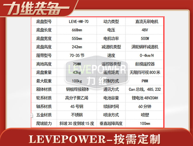 履帶底盤長668mm,履帶底盤寬550mm,履帶底盤高242mm,無線遙控履帶底盤箱體采用鋼板材質(zhì)焊接而成,防腐性能好。履帶底盤動力采用48V500W直流無刷電機(jī),渦輪蝸桿減速機(jī)動力更強(qiáng),轉(zhuǎn)彎靈活。履帶底盤電池采用48V20AH鋰電池,續(xù)航時間更長,是一款不錯的機(jī)器人橡膠履帶。