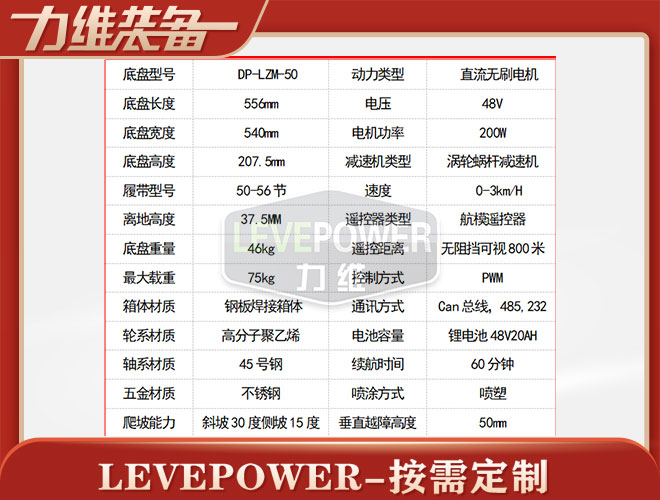 橡膠履帶底盤長(zhǎng)556mm,橡膠履帶底盤寬540mm,橡膠履帶底盤高207.5mm,無(wú)線遙控履帶底盤采用48v200W直流無(wú)刷永磁電機(jī),渦輪蝸桿減速機(jī)動(dòng)力更強(qiáng),轉(zhuǎn)彎靈活,操控簡(jiǎn)單。履帶底盤電池采用48V20AH鋰電池續(xù)航時(shí)間更長(zhǎng)。履帶底盤箱體采用鋼板焊接而成,輪系采用高分子聚乙烯,履帶底盤整體重量輕,耐磨性強(qiáng)。