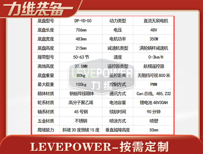 橡膠履帶底盤長700mm左右,履帶底盤寬340mm左右,履帶底盤高110mm左右,整車采用6061鋁合金箱體焊接,材質(zhì)輕,耐腐濁,履帶車搭載24v200W直流永磁無刷電機,渦輪蝸桿減速機,動力強,體積小,防水性能好,越野性能強,可用于管道清淤,偵查、巡檢等場景。